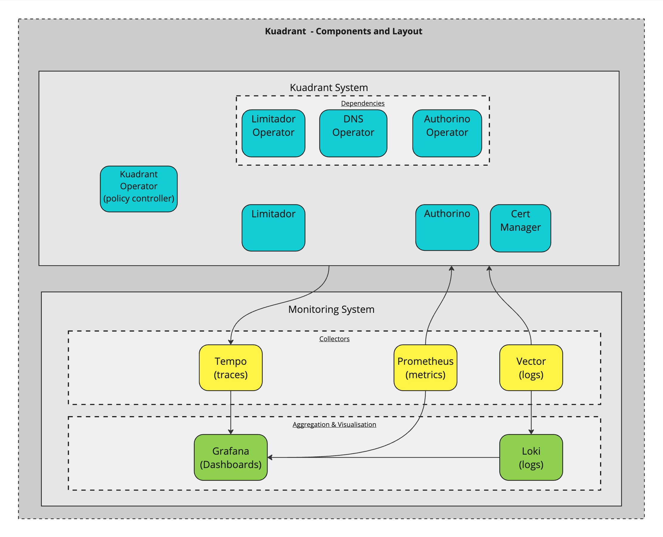 The Kuadrant architecture is intended to work with some popular monitoring tools for tracing, metrics and log aggregation. Those tools are:
