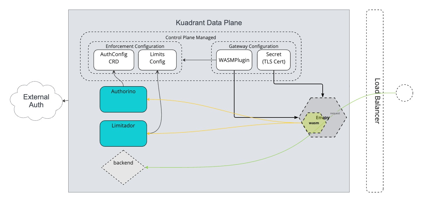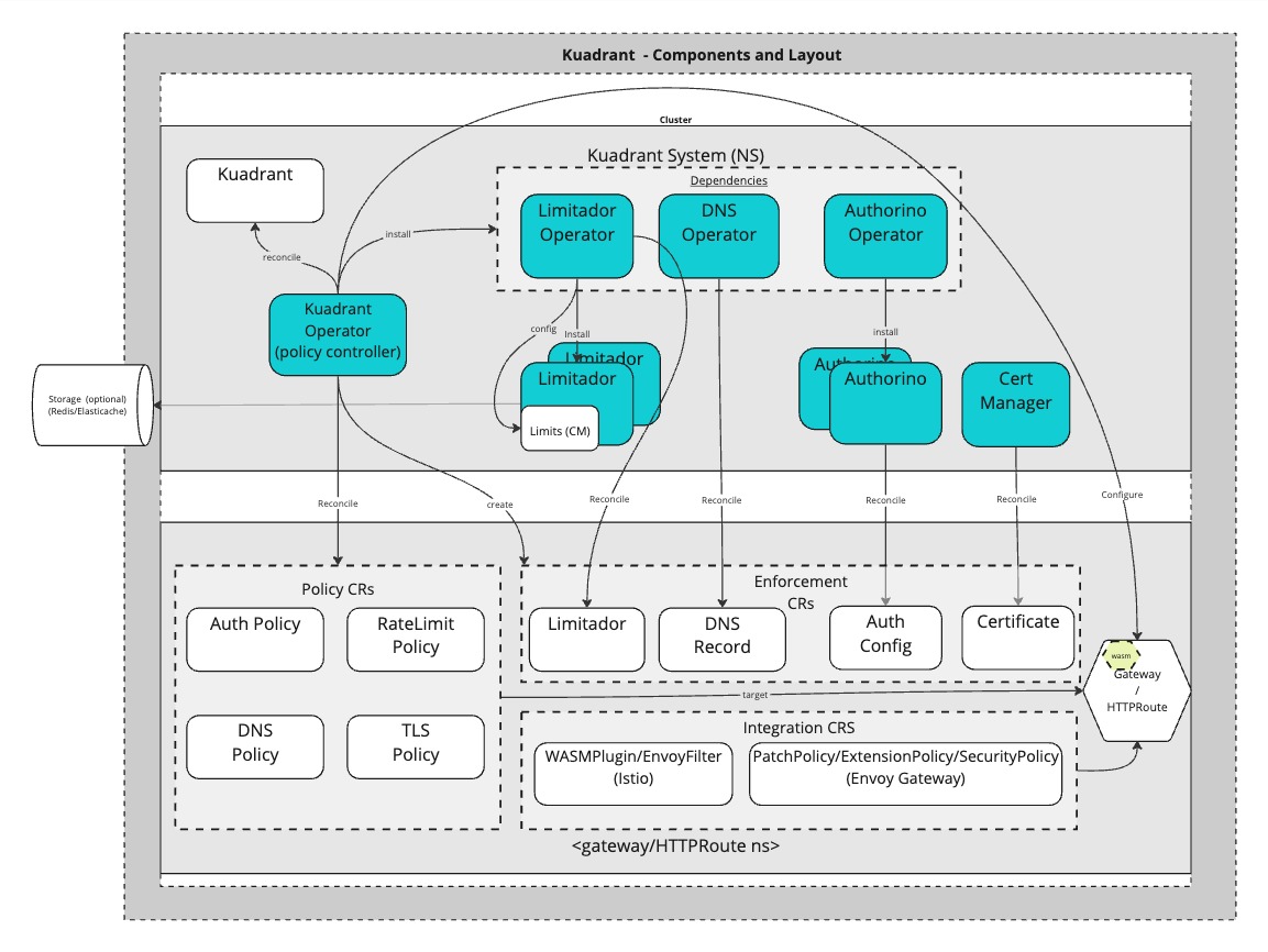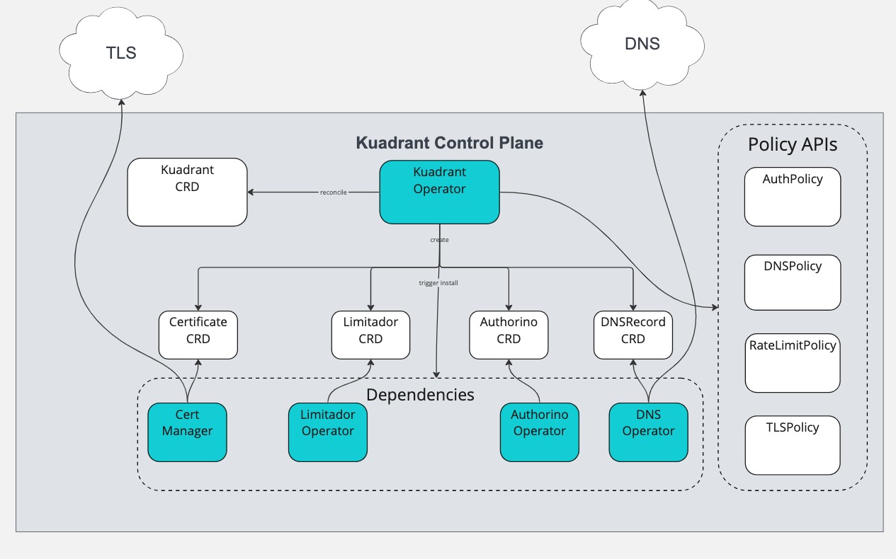 Kuadrantand reconciles this to configure and trigger installation of the required data plane components and other control plane components.