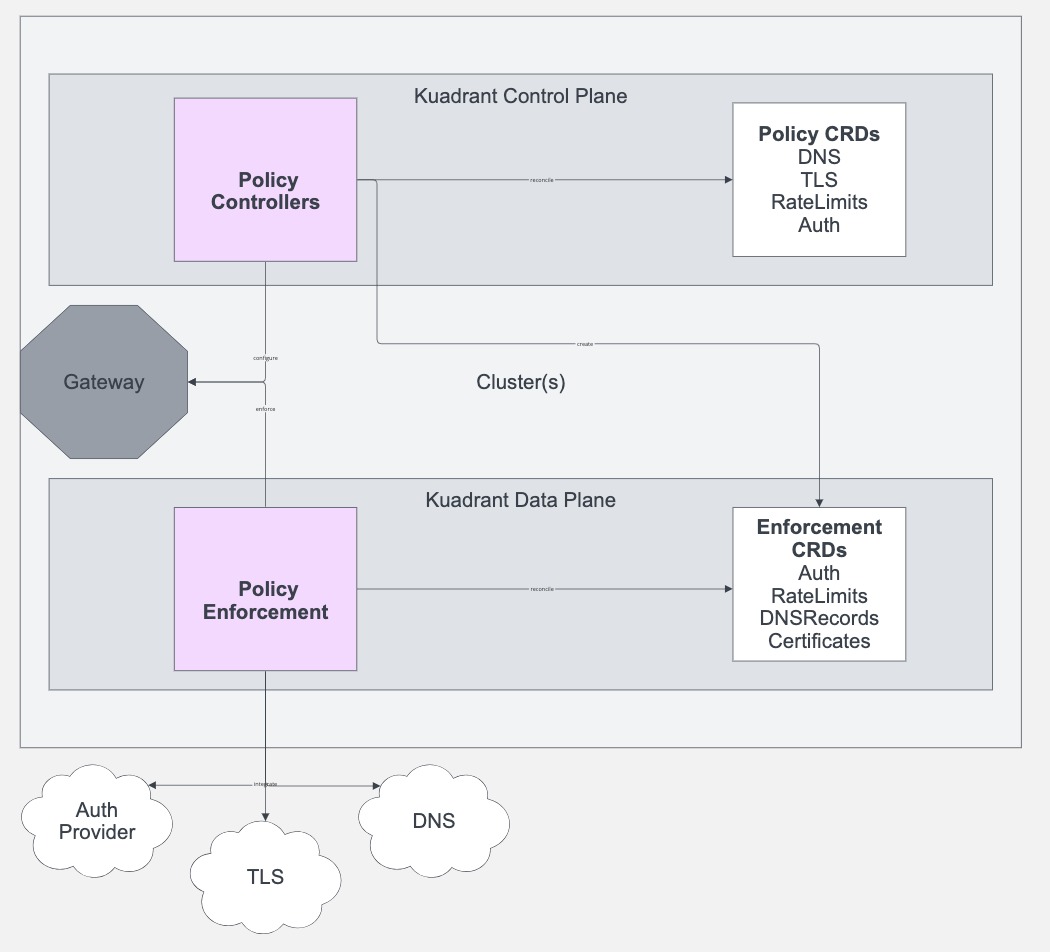 RateLimitPolicy,AuthPolicy,DNSPolicyandTLSPolicyand reconciles these into enforceable configuration for the data plane. - Exposes