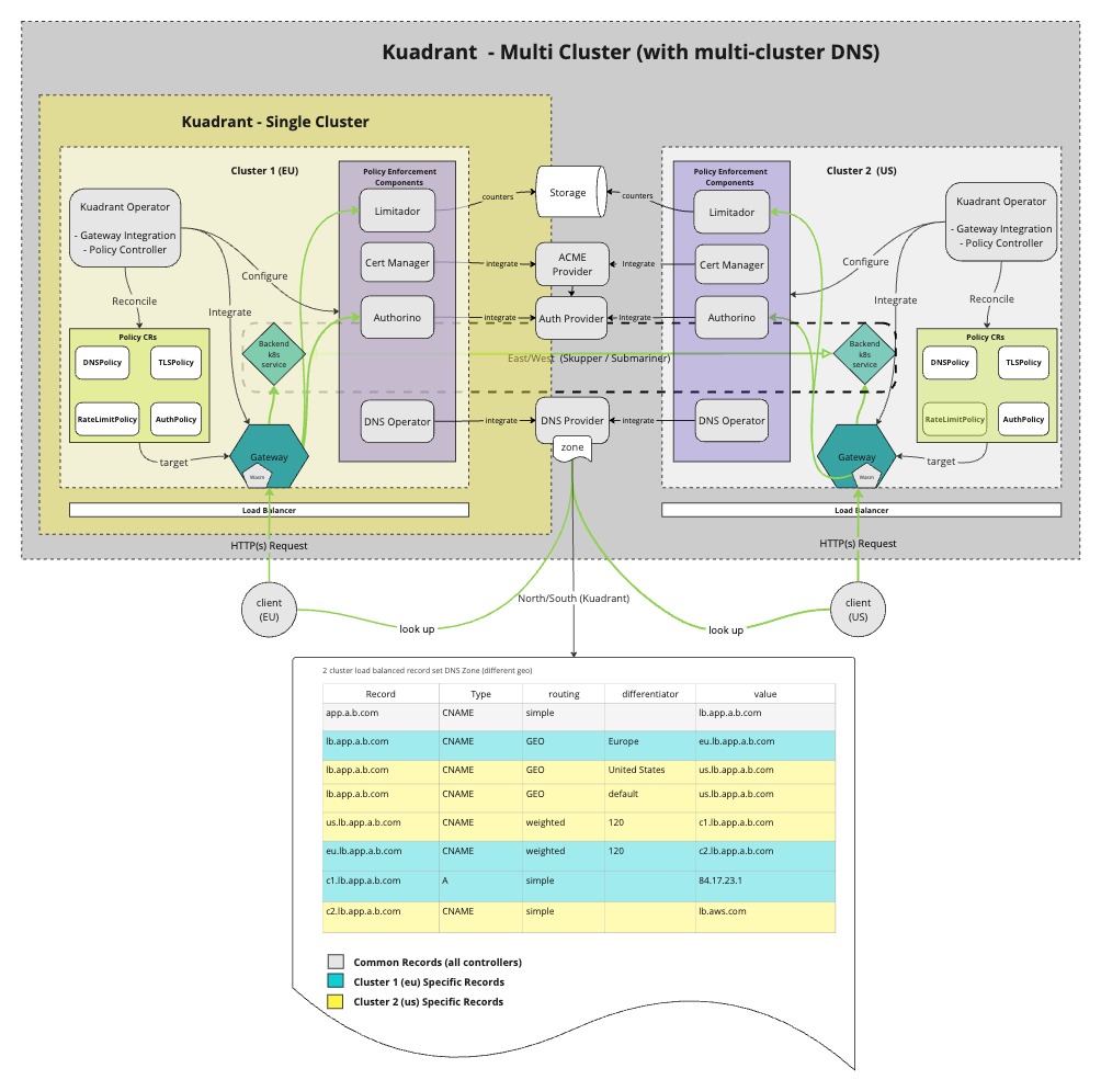 In the default multi-cluster setup, each individual cluster has Kuadrant installed. Each of these clusters are unaware of the other. They are effectively operating as single clusters. The multi-cluster aspect is created by sharing access with the DNS zone, using a shared host across the clusters and leveraging shared counter storage. Multi cluster DNS is achieved by using the eventual provider DNS service (AWS Route etc ..) as a store for ownership metadata using specially created TXT records, and as a central API service that all clusters can communicate with. The zone is operated on independently by each of DNS operator on both clusters to form a single cohesive record set. Each cluster processes its own DNSRecords, becoming aware of other DNSRecords contributing to the same set of endpoints via this centrally stored data, in turn allowing it to correctly translate the DNSRecord endpoints into an appropriate API operation. More details on this can be found in the following RFC. The rate limit counters can also be shared and used by different clusters in order to provide global rate limiting. This is achieved by connecting each instance of Limitador to a shared data store that uses the Redis protocol.